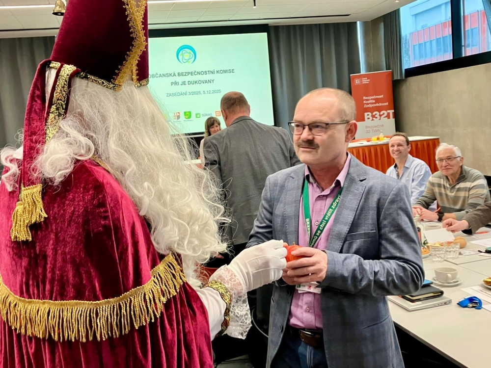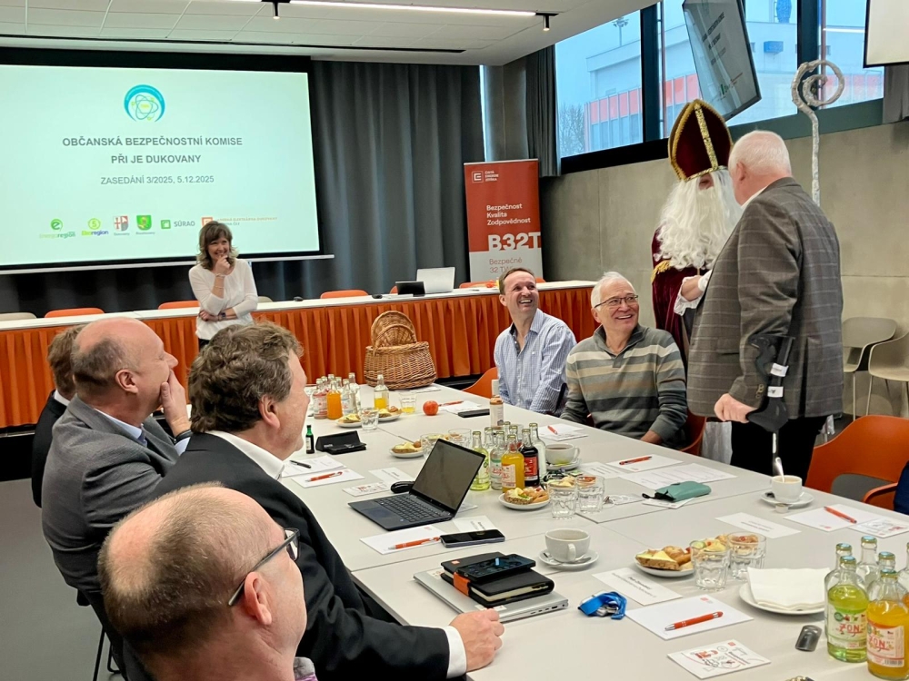 Závěrečné zasedání Občanské bezpečnostní komise při JE Dukovany roku 2025 se uskutečnilo 5. prosince, zasedání v úvodu navštívil i sv. Mikuláš, který všechny přítomné obdaroval vlídným slovem a drobnými dárečky.