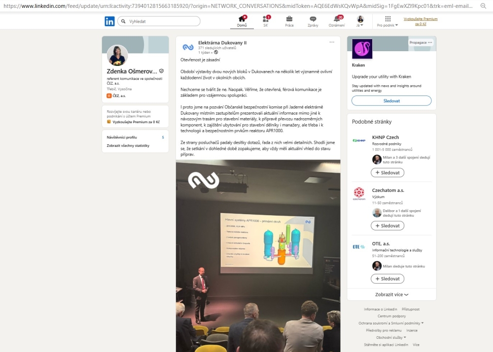 Zástupci společnosti Elektrárna Dukovany II přijali pozvání Občanské bezpečnostní komise při JE Dukovany ke společnému setkání, při kterém v polovině listopadu místním zastupitelům prezentovali aktuální informace mimo jiné k návozovým trasám pro stavební materiály, k přípravě převozu nadrozměrných komponent, k zajištění ubytování pro stavební dělníky i manažery, ale třeba i k technologii a bezpečnostním prvkům reaktoru APR1000, jehož stavba je v okolí dukovanské jaderné elektrárny v plánu a přípravy jsou v plném proudu.