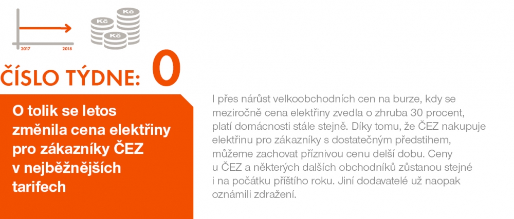 O tolik se letos změnila cena elektřiny pro zákazníky ČEZ v nejběžnějších tarifech. I přes nárůst velkoobchodních cen na burze, kdy se meziročně cena elektřiny zvedla o zhruba 30 procent, platí domácnosti stále stejně. Díky tomu, že ČEZ nakupuje elektřinu pro zákazníky s dostatečným předstihem, můžeme zachovat příznivou cenu delší dobu. Ceny u ČEZ a některých dalších obchodníků zůstanou stejné i na počátku příštího roku. Jiní dodavatelé už naopak oznámili zdražení.